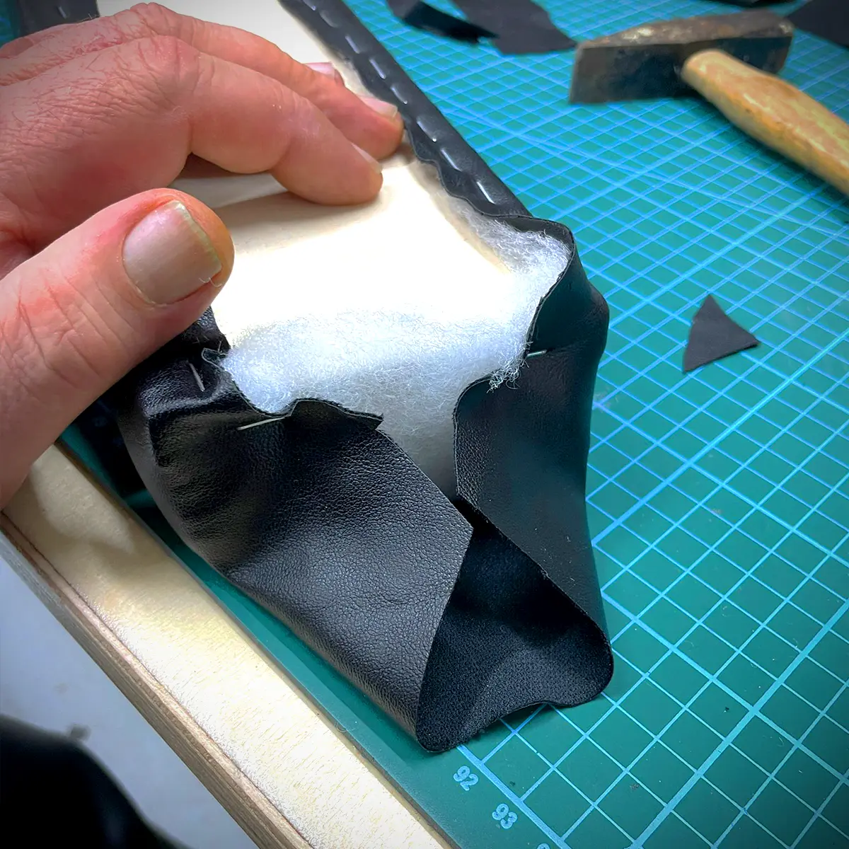 Als Grundlage für die Polster nehme ich entweder Sperrholz oder wie hier ein einfaches Brettchen. Damit ich die Polster auch vernünftig an- und abschrauben kann. versehe ich sie mit Einschraubgewinden.