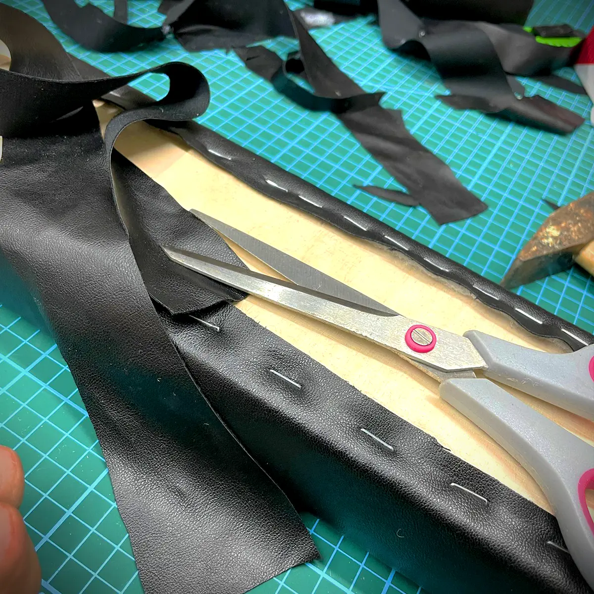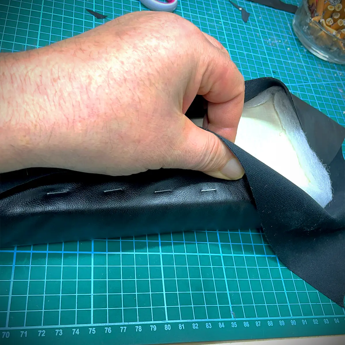 Als erstes wird der Schaum mit Sprühkleber auf dem Holz fixiert.