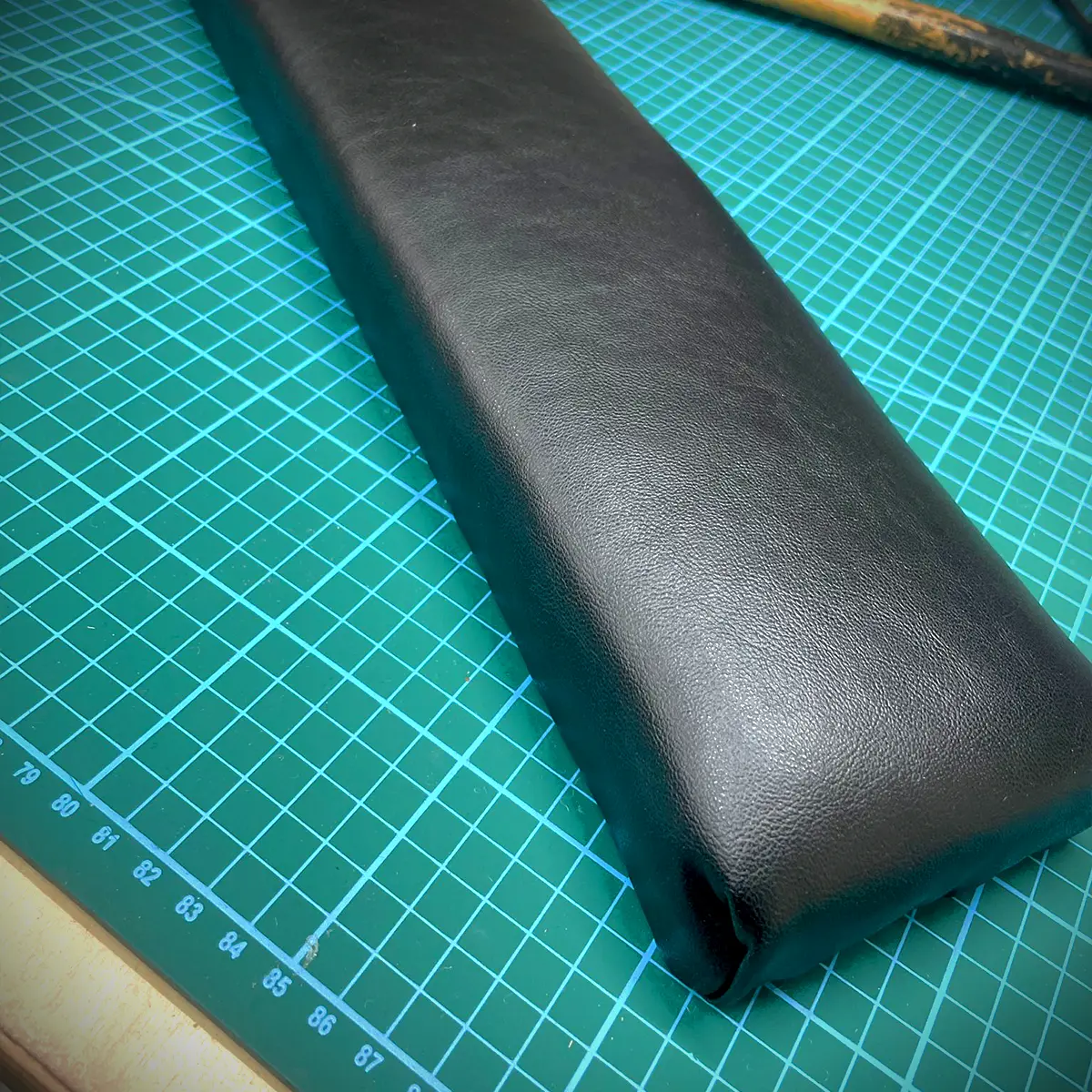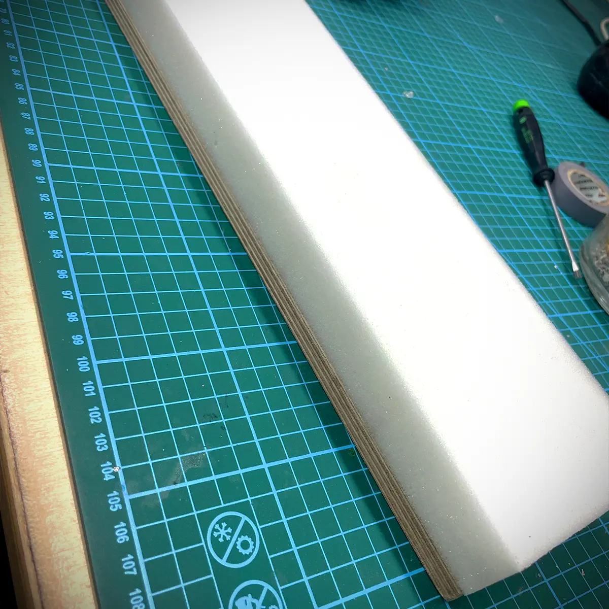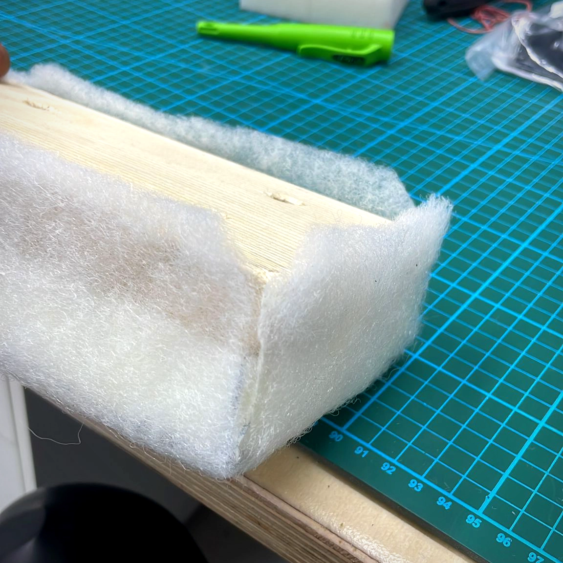 So sieht es dann aus, wenn der Schaum mittels Sprühkleber (vor dem Verbinden 5min warten!) auf dem Holz befestigt ist.