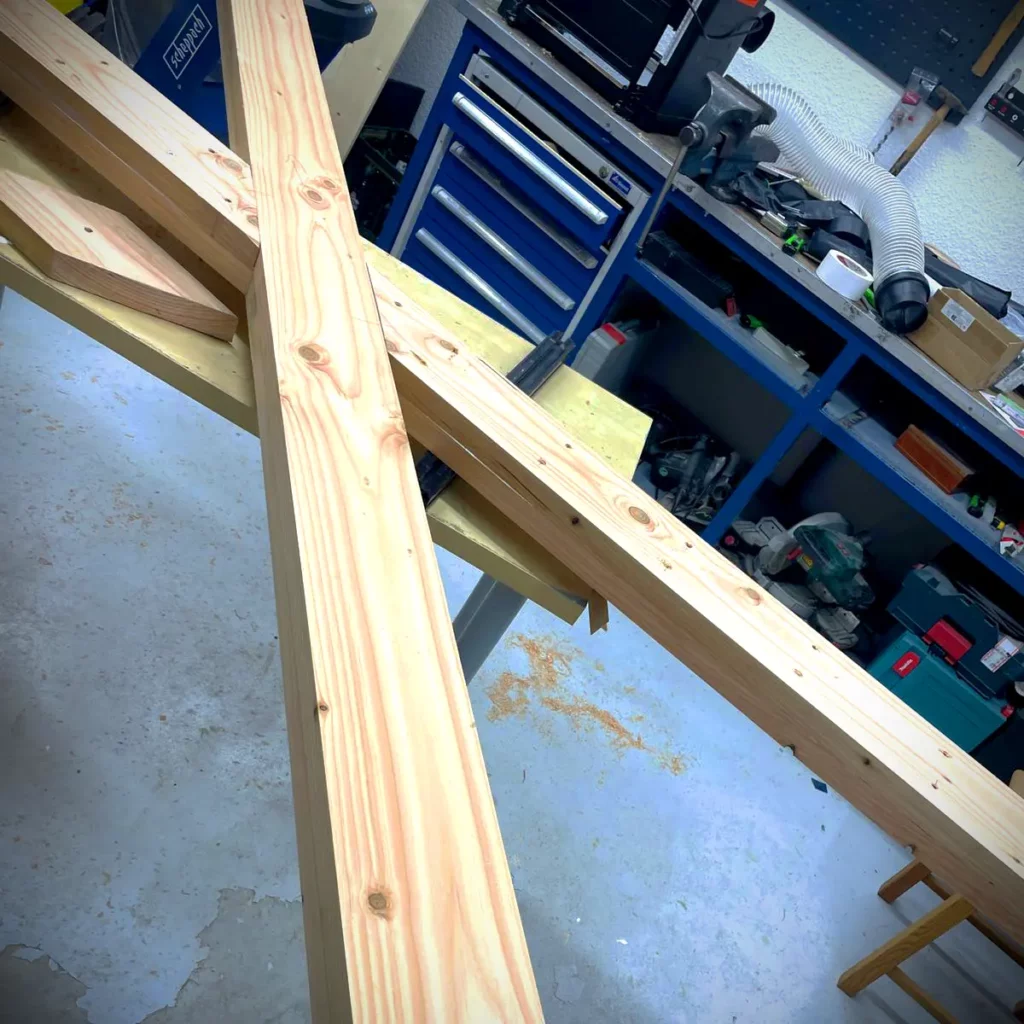 Die Bohlen waren ursprünglich etwas über 5m lang. Also habe ich sie halbiert und bei zweien dann die Mitte ausgemessen und mit einer dicken Schraube verbunden. Dann habe ich die 45° ausgemessen, auf beiden Brettern angezeichnet und gesägt.