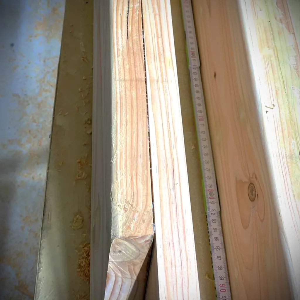 Bevor ich überhaupt anfangen konnte, habe ich die Bohlen mit einem Balkenhobel geglättet und alle auf die gleiche Stärke gebracht. Leider habe ich kein Bild vom Vorher/Nachher. Aber hier mal ein Beispiel: Das war vor dem Hobeln eine ordinäre Dachlatte.