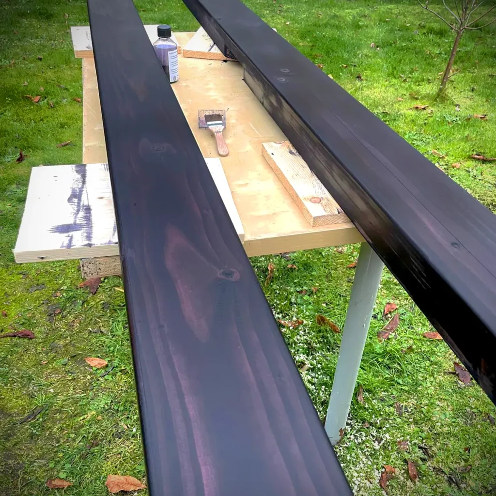Als nächstes habe ich dann alles zweimal gebeizt und direkt im Anschluss auch zweimal geölt.Zum Ölen benutze ich übrigens immer recht günstiges „Pferde-Öl“. Irgendwie ist da für mich kein Unterschied zu de teuren Zeug feststellbar.