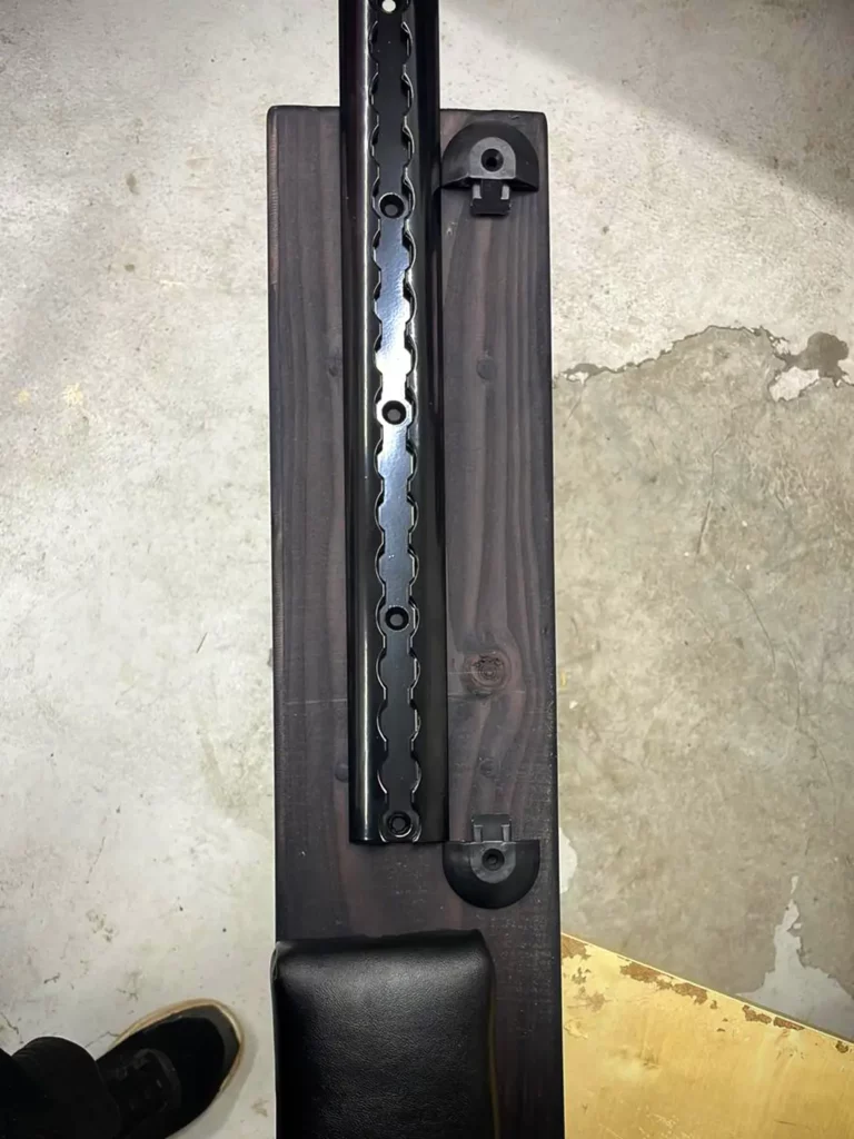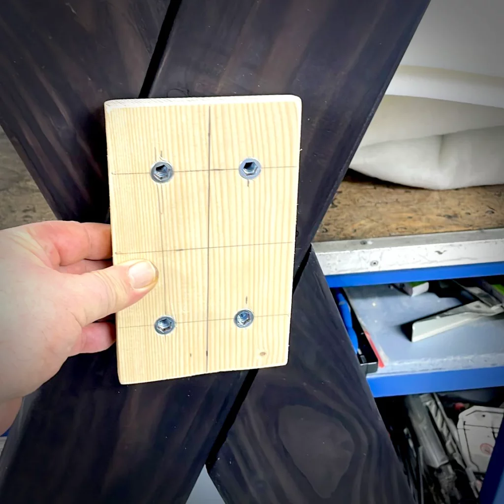 Und siehe da – da sind die Schräubchen für das Polster. Und wie man sieht, habe ich die Schenkel noch mit einer M10 Gewindestange miteinander verbunden.