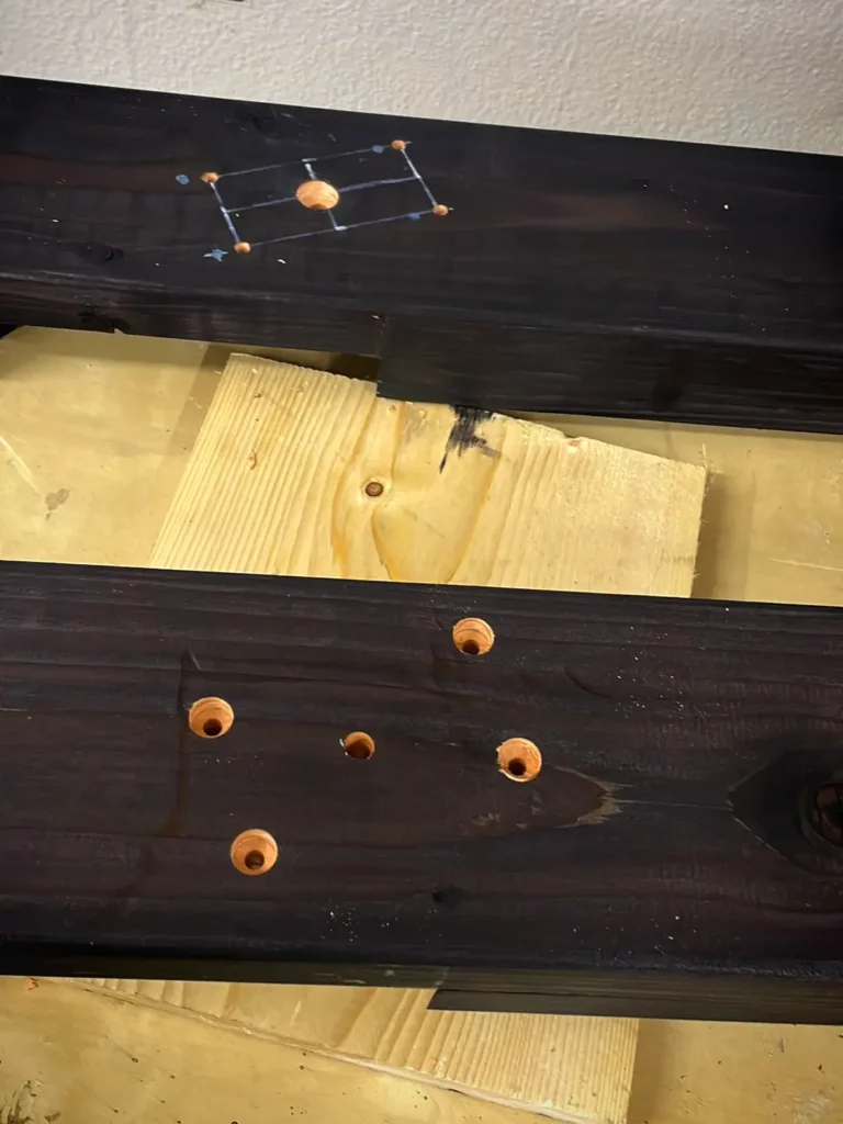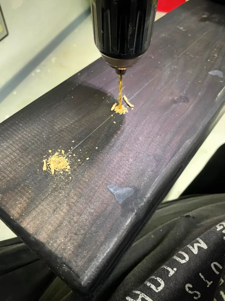Jetzt kommen die Löcher für die Polster. Damit die Schrauben nachher nicht doof rausgucken, habe ich mit einem Forstner Bohrer die Löcher erweitert.