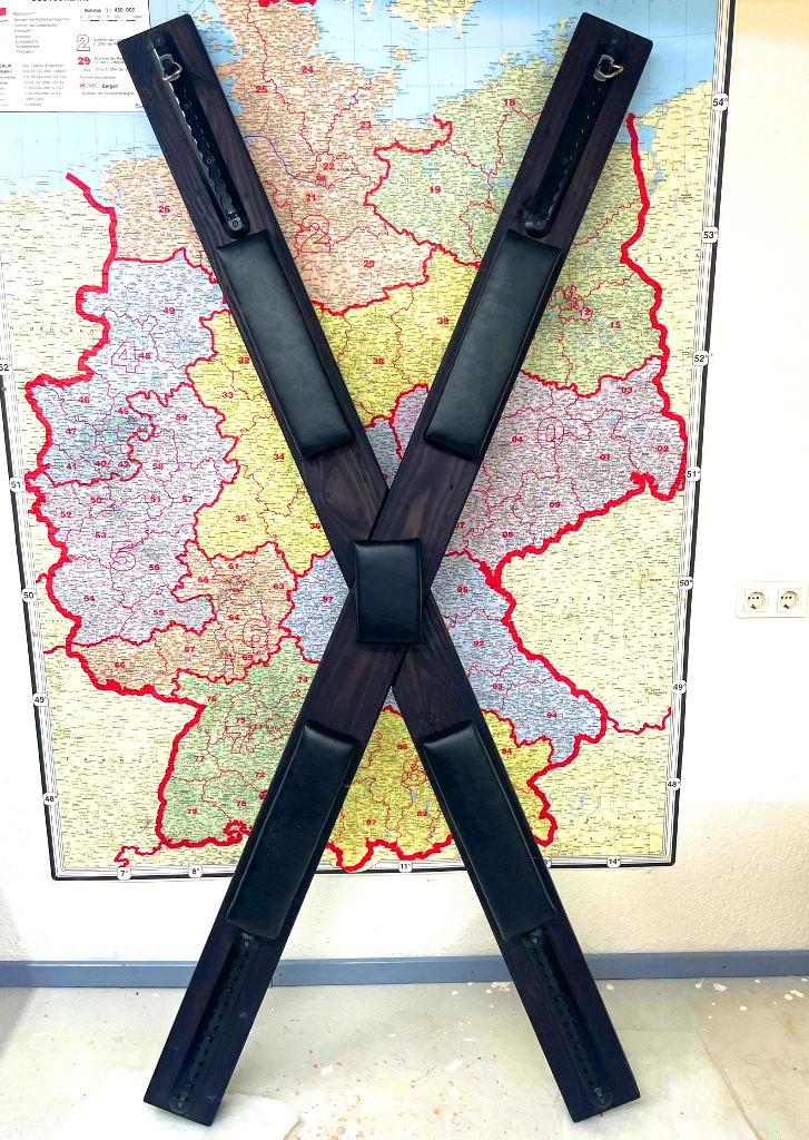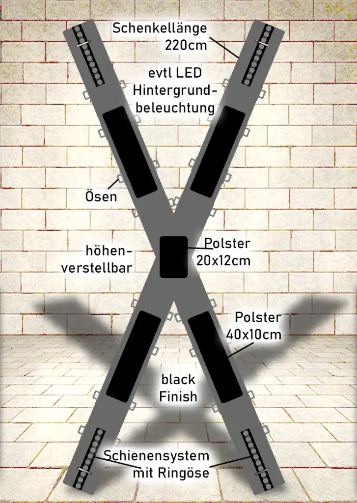 Ich habe viel im Netz geschaut und mich inspirieren lassen, wie andere das machen. Aber so richtig Maße oder Winkel konnte ich nicht finden. Nach einigen Gesprächen kam ich dann zu einer Schenkellänge von 2.2m und dass der Winkel zwischen diesen 45° betragen sollte. Dann sollten die Fixierungspunkte für Hände und Füße super leicht verstellbar sein. Auch war klar, dass das Kreuz nicht an der Erde stehen sollte und der Boden darunter sollte super rutschfest sein. Eine super schnell und einfach zu bedienende Höhenverstellung wäre auch toll. Ach ja – ein paar Polster sollten auch vorhanden sein, sowie die Möglichkeit, ein paar Zusatzgurte verrutsch-sicher anzubringen. Ist echt ne große Liste für nur ein Kreuz…