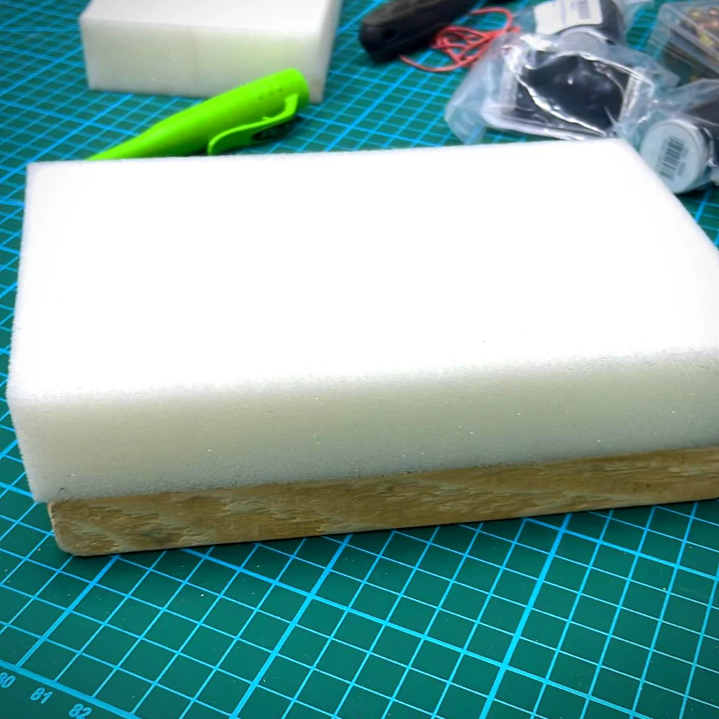 Ich verwende hier jetzt mal PUR Schaumstoff RG40. Für die Polster habe ich gleich die entsprechenden Zuschnitte bestellt. Aber mit einem scharfen Cuttermesser ist das auch kein Problem.